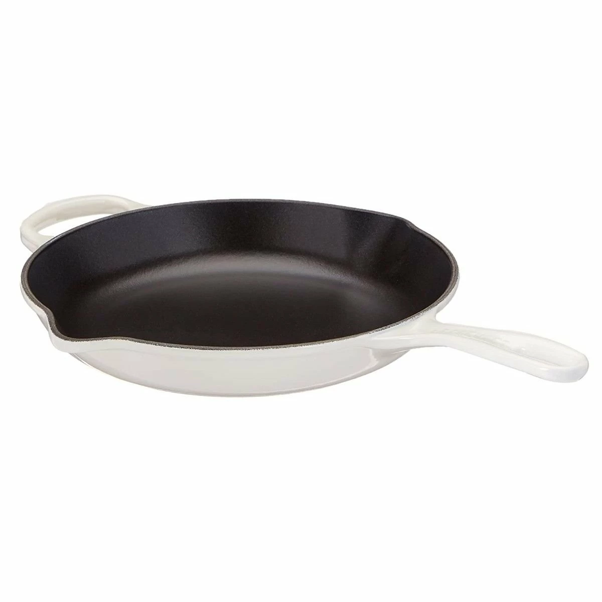 - 10.25” Signature Skillet: Baking, sautéing, and frying delicious food is easy and fun with the Signature Iron Handle 10.25” Skillet from Le Creuset. This enameled cast iron frying pan will become a staple in your daily cooking routine. It only gets better with age, too; over time a natural patina develops on the black enamel that is ideal for either searing or frying. This also means there is no need to season the cast iron. There is a large handle and a convenient helper handle on the opposite side to assist when carrying between the oven, stovetop, and table.