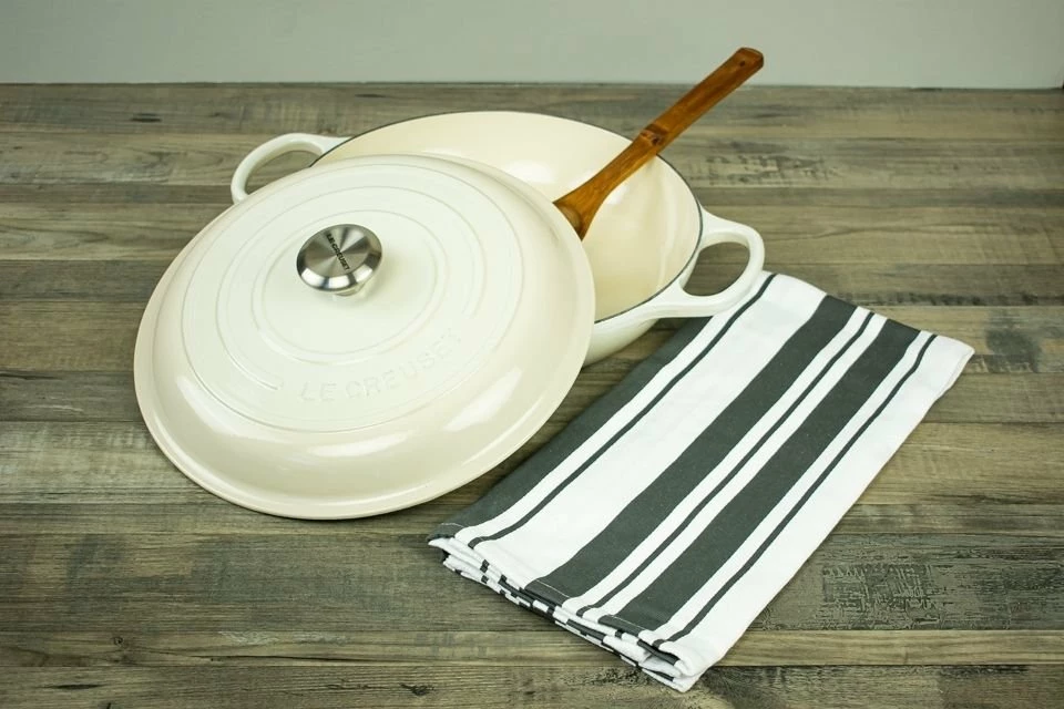 The family will rush to the table for a hearty meal braised and browned in Le Creuset’s 5-Quart Signature Braiser in Meringue. With a dome-shaped lid that locks in flavor by promoting the continuous circulation of heat and moisture and Le Creuset’s signature enameled-coated cast iron, this braiser brings the performance you need to turn out mouth-watering braised meats and vegetables.