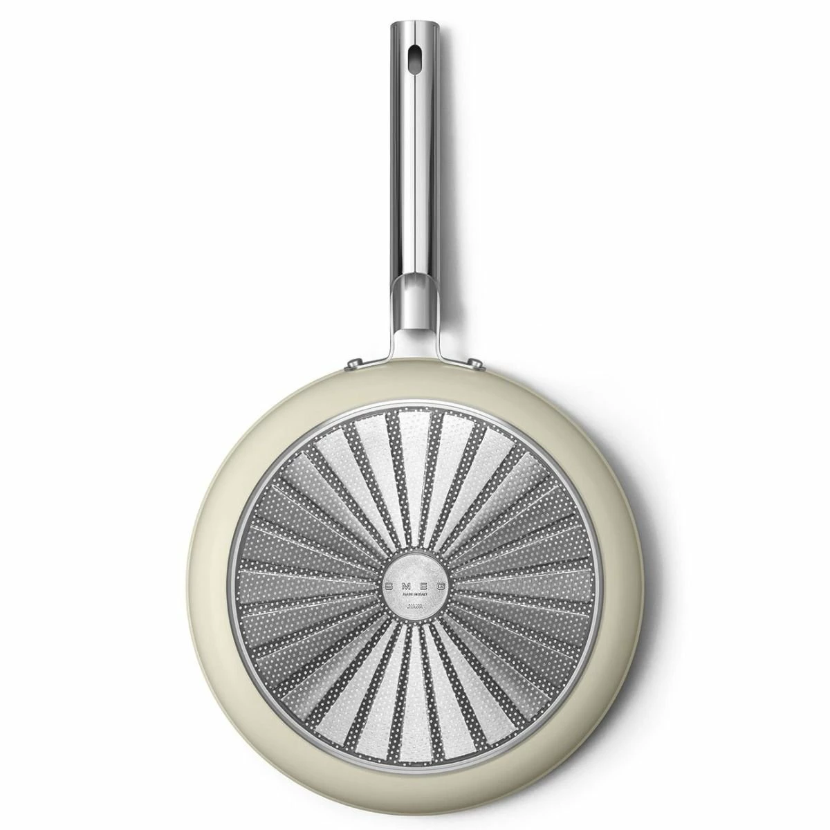 Fry all your breakfast meals and meats with the new SMEG 12” Frying Pan in Cream! Designed by Italian firm Deepdesign, this frying pan has a cold-forged aluminum base with a stainless steel handle and bottom plate, making for a sturdy nostalgic design that meets contemporary application for it to be the prominent kitchen pan. From making omelets to skillet meals and frying burgers to small steaks, cooking in its nonstick Teflon coating allows swift release to cooked foods, makes cleaning less of a chore, and also reduces how much cooking oil you would typically use. You may even use this pan to make delicious red or white sauces for any type of pasta or to make excellent vegetable stirfries! This fry pan can be used on all types of stoves, including induction, and is also heat resistant up to 480°F, meaning it will handle serious heat emitting from the stove top and dishwasher use time and time again. With its capabilities and two-year warranty, you cannot ask for more ease and convenience when using the SMEG 12” Frying Pan in Cream!