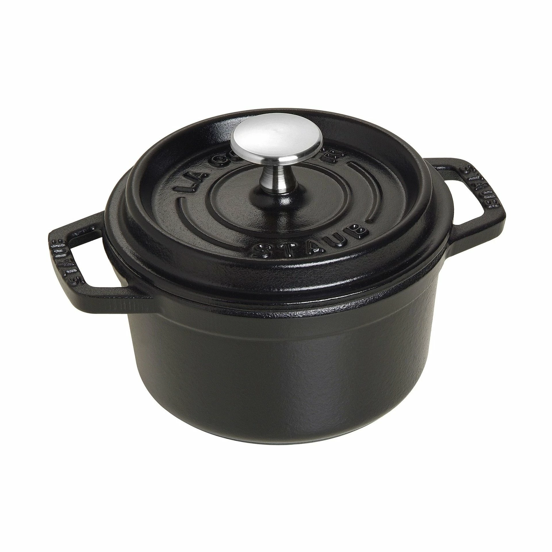 Bring your family together with hearty roasts and soups with the Staub Round Cocotte also known as a French or Dutch Oven. Crafted from strong, durable cast iron this heavy weight dutch oven will be your go to cookware for numerous family favorite recipes including but not limited to macaroni and cheese, braised beef and chocolate souffle. The tight-fitting lid retains essential moisture and features Self-Basting spikes that contribute to a more effective basting while you’re cooking. The smooth enamel bottom works on all stovetops and is oven safe up to 500 degrees Fahrenheit. With no seasoning needed you can start making dinner meals and desserts everyone will love. The lovely black matte color and chip-resistant finish makes for a perfect centerpiece while serving and with a lifetime warranty you can expect to have this wonderful Staub Round Cocotte/Dutch Oven to pass down to generations in your family.