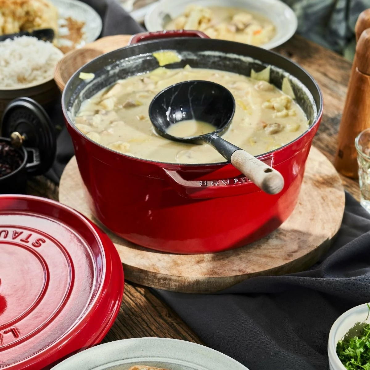 Bring your family together with hearty roasts and soups with the Staub Round Cocotte also known as a French or Dutch Oven. Crafted from strong, durable cast iron this heavy weight dutch oven will be your go to cookware for numerous family favorite recipes including but not limited to macaroni and cheese, braised beef and chocolate souffle. The tight-fitting lid retains essential moisture and features Self-Basting spikes that contribute to a more effective basting while you’re cooking. The smooth enamel bottom works on all stovetops and is oven safe up to 500 degrees Fahrenheit. With no seasoning needed you can start making dinner meals and desserts everyone will love. The lovely cherry color and chip-resistant finish makes for a perfect centerpiece while serving and with a lifetime warranty you can expect to have this wonderful Staub Round Cocotte/Dutch Oven to pass down to generations in your family.
